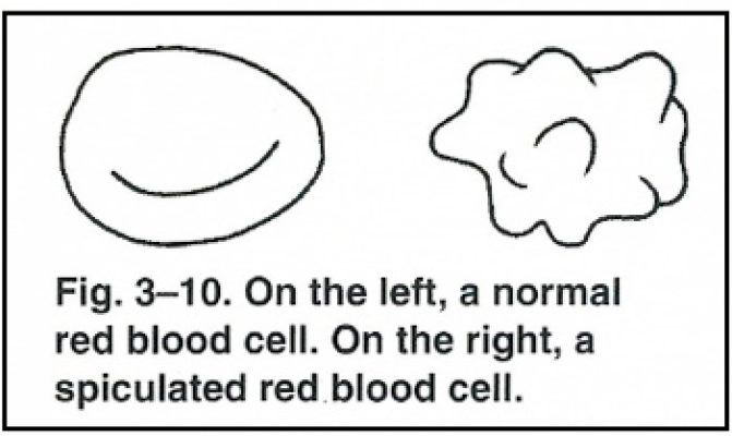 I globuli rossi che si trasformavano da discociti a echinociti variavano da leggermente gonfi a sferici e contenevano proiezioni di membrana che variavano da spicole arrotondate a molto distinte.